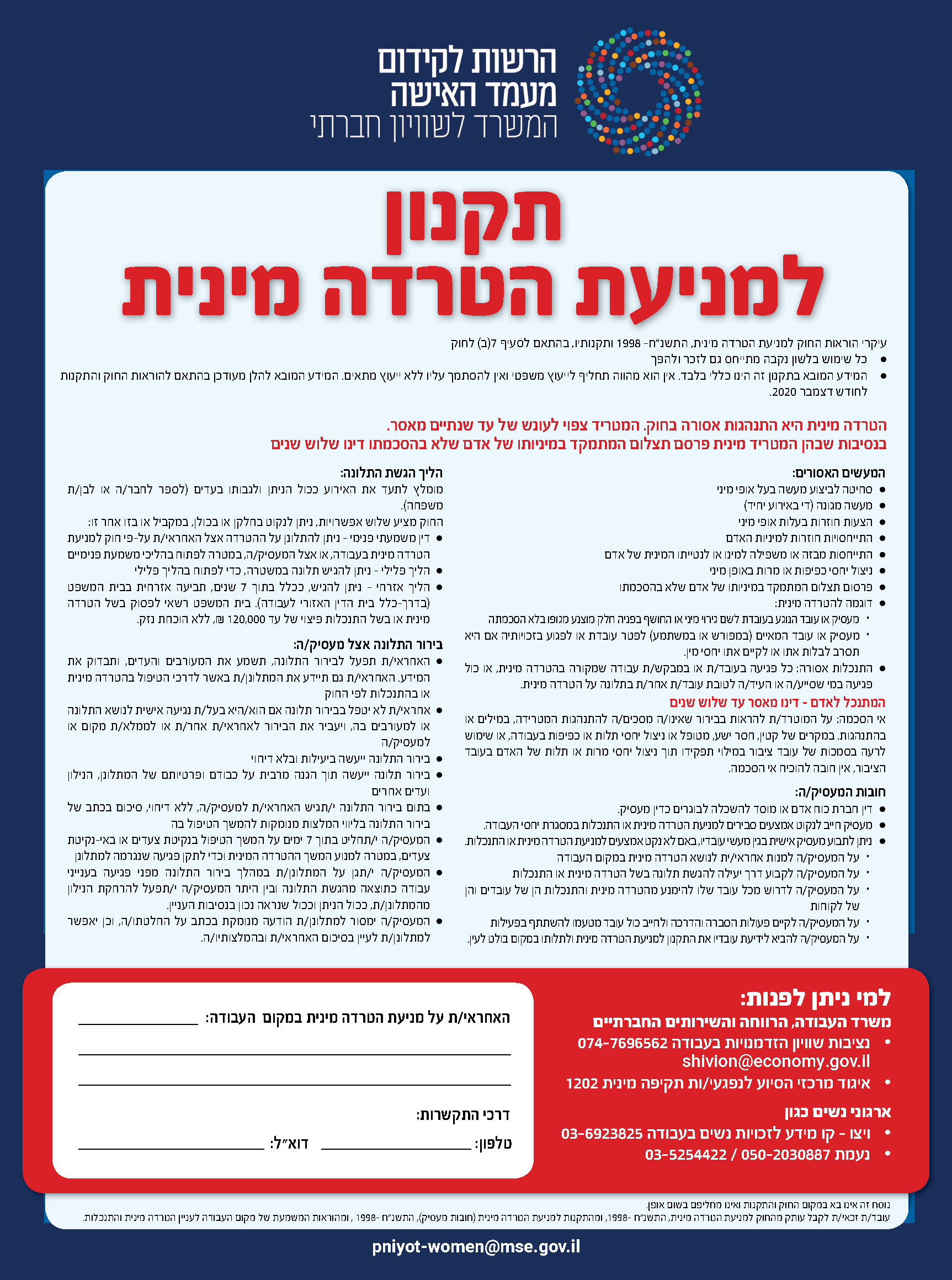 כל עובד זכאי לקבל מהמעסיק תקנון למניעת הטרדה מינית